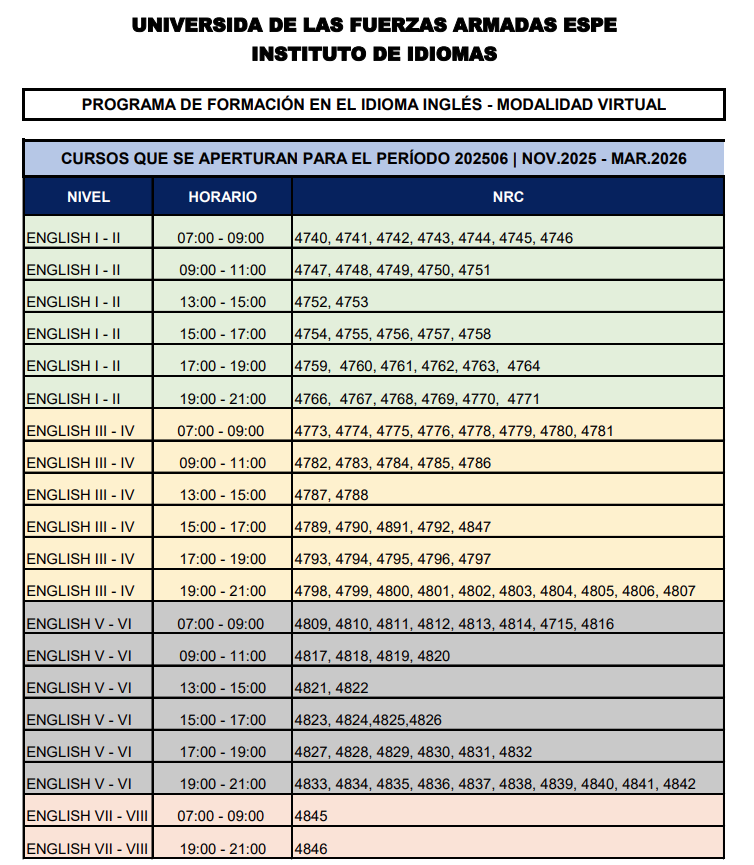 INFORMACIÓN SÓLO PARA LOS ESTUDIENTES INTERNOS DE LAS CARRERAS DE PREGRADO DE LA UNIVERSIDAD DE LAS FUERZAS ARMADAS ESPE, PERÍODO ACADÉMICO SII- 2025 (NOV 2025- MARZO 2026)