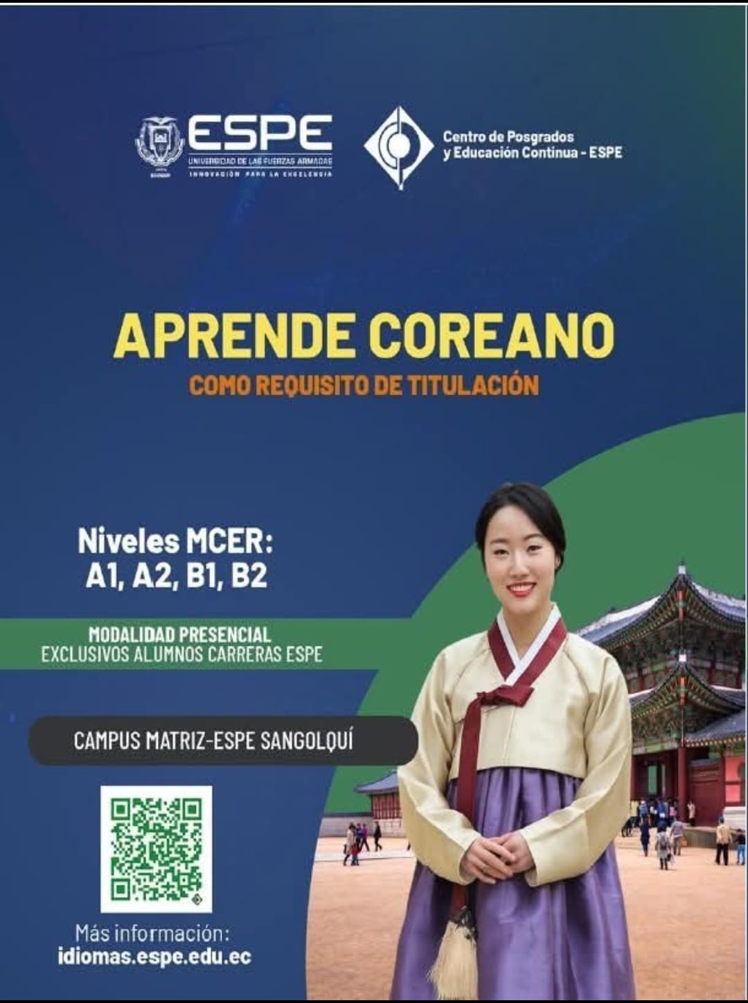 - Los estudiantes regulares de las carreras de pregrado de la Universidad de las Fuerzas Armadas ESPE, pueden cursar el Programa de Formación en el Idioma Coreano y presentar el certificado correspondiente como requisito válido para su proceso de titulación.